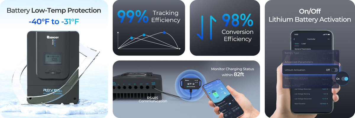 Feature: 99% tracking / up to 98% peak conversion; supports 12/24/36/48V; full protections Advantage: ≈800W array fits the controller’s sweet spot; faster recharge in good sun Benefit: Shorter recharge windows, higher solar self-sufficiency, more flexible daily plans